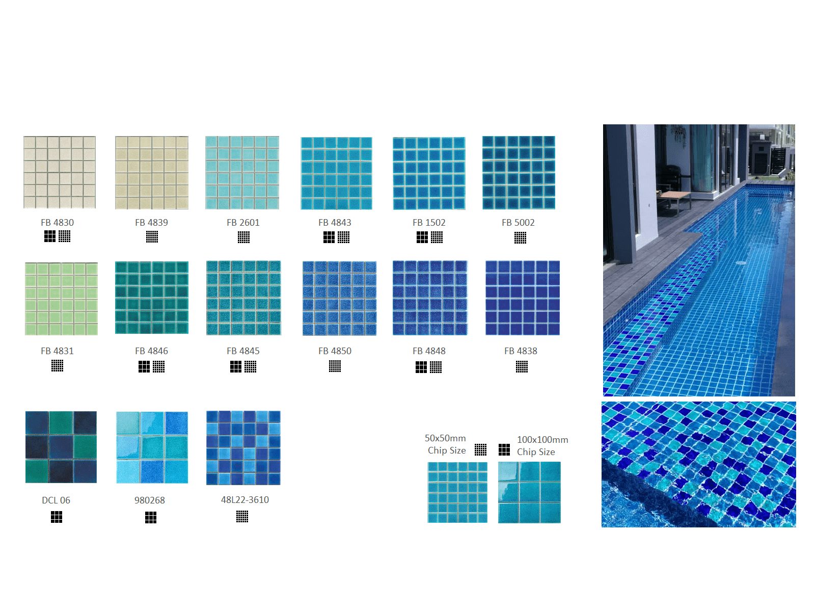 Our range of swimming pool tiles & mosaic collections are carefully hand-picked by our dedicated pool finishing professionals. This means your swimming pool aesthetics will not go wrong. Commonly available in 50 x 50mm chip sizes and other sizes upon request.